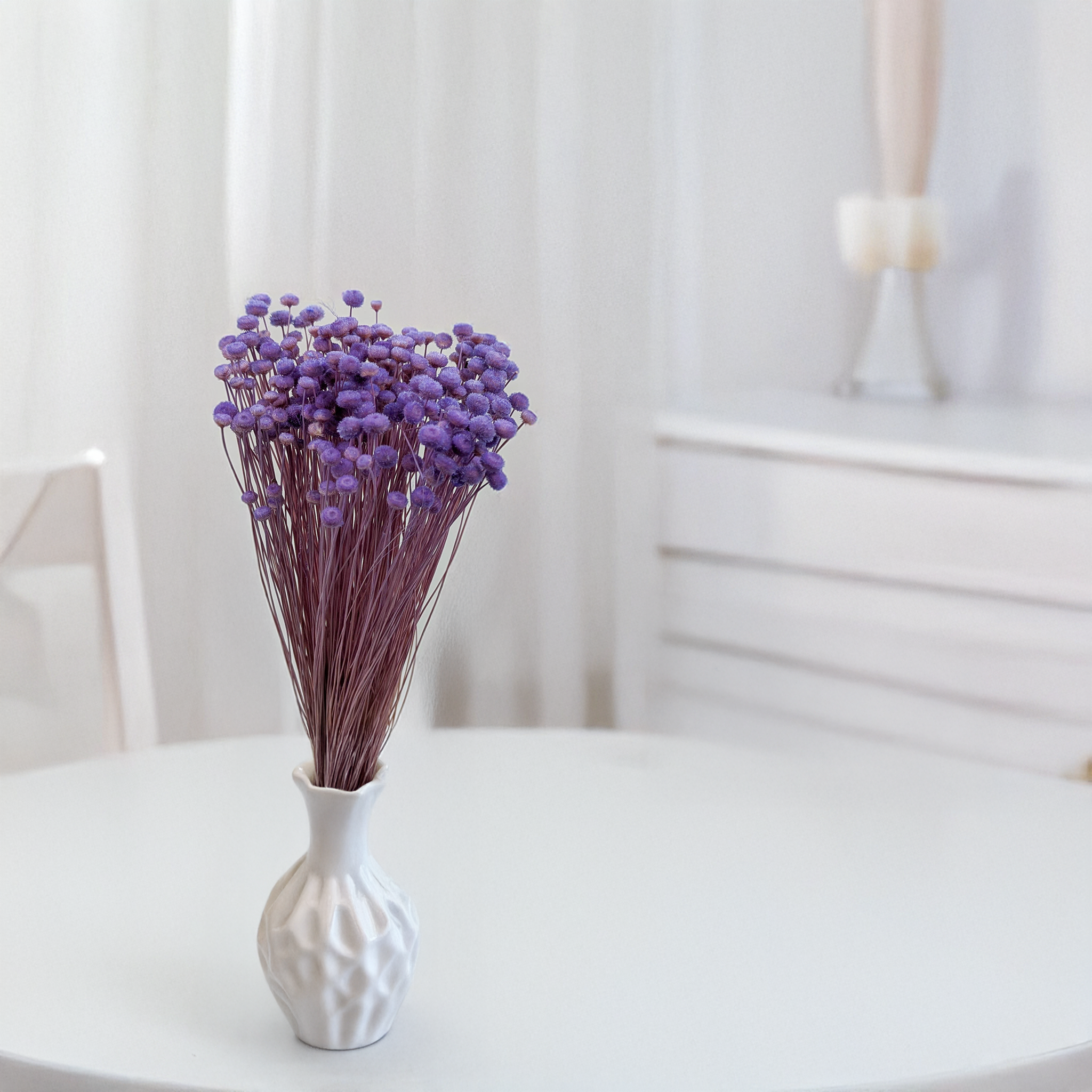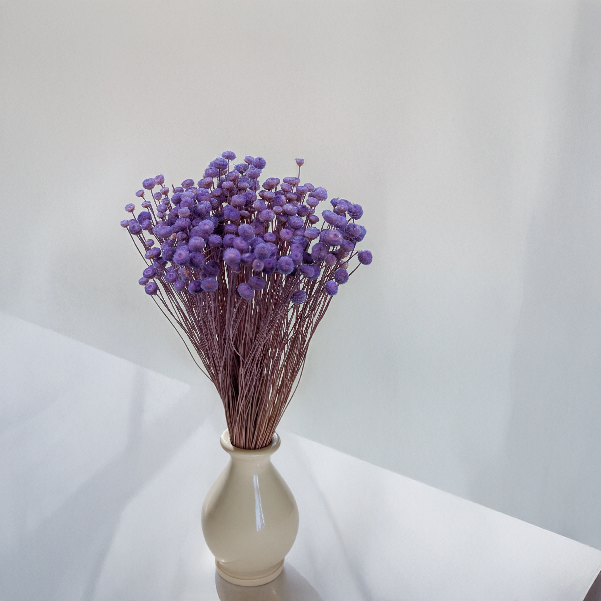 Amarelino in der Lavendelfarbe sieht aus wie ein kleiner Ball, eine lila Blase am Stiel. Es eignet sich perfekt für Blumenarrangements und Sträuße. Getrocknete Amarelino-Blumen in lila Farbe eignen sich als Dekorationen für Kuchen, Ergänzungen für Fotoshootings und Produktpräsentationen.