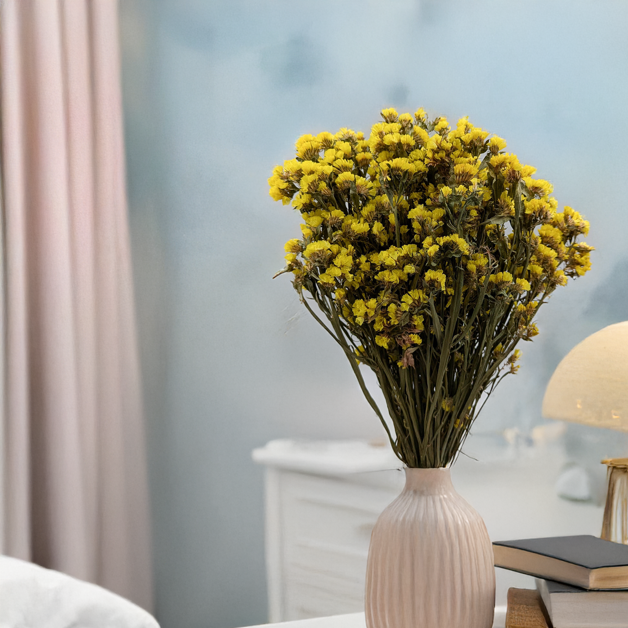 Getrockneter Strandflieder ist eine ästhetische und langlebige Ergänzung für Innenräume und florale Arrangements. Sein kräftiger Gelbton verleiht jedem Raum einen eleganten und sonnigen Akzent. Durch die natürliche Trocknung behält er lange seine Form und Farbe.