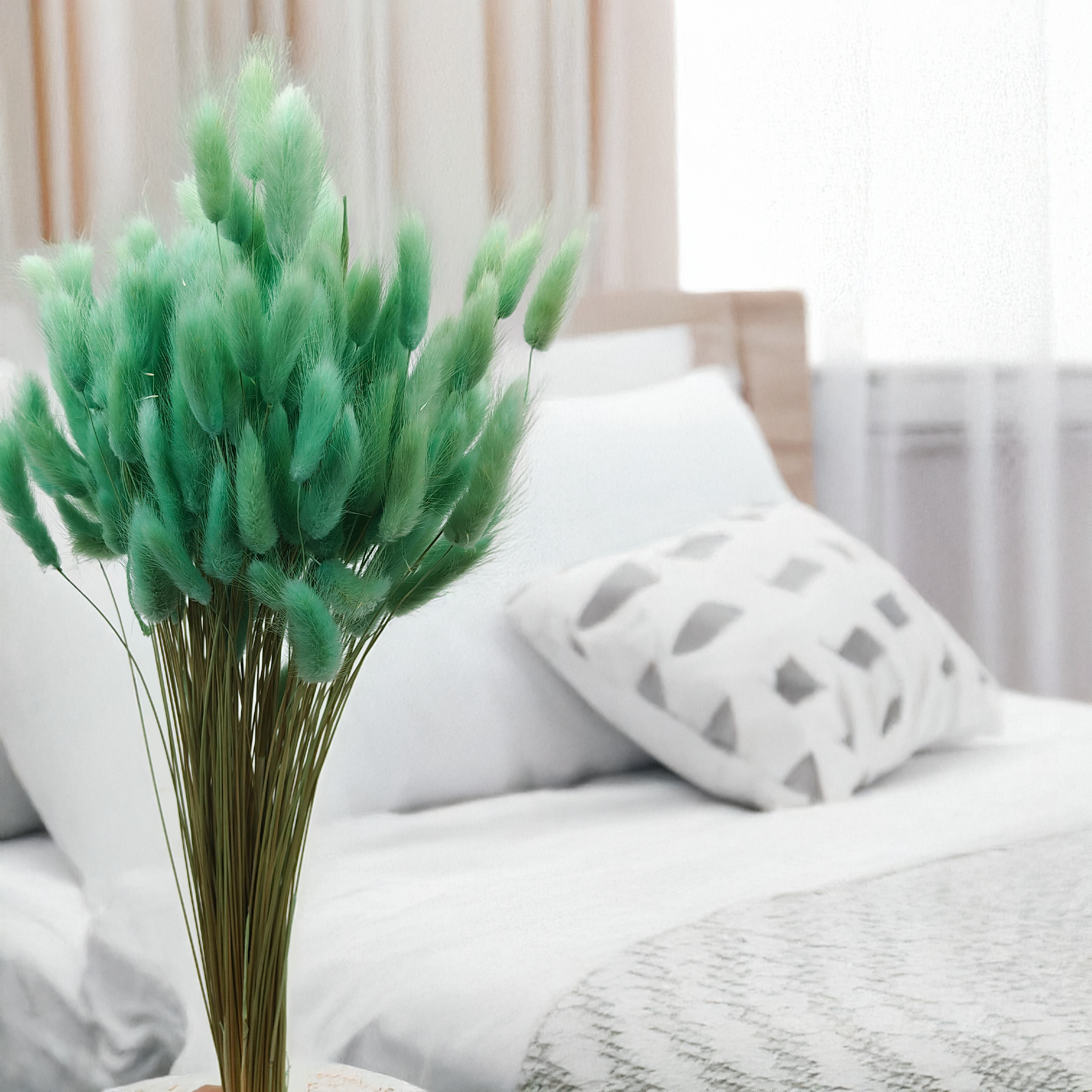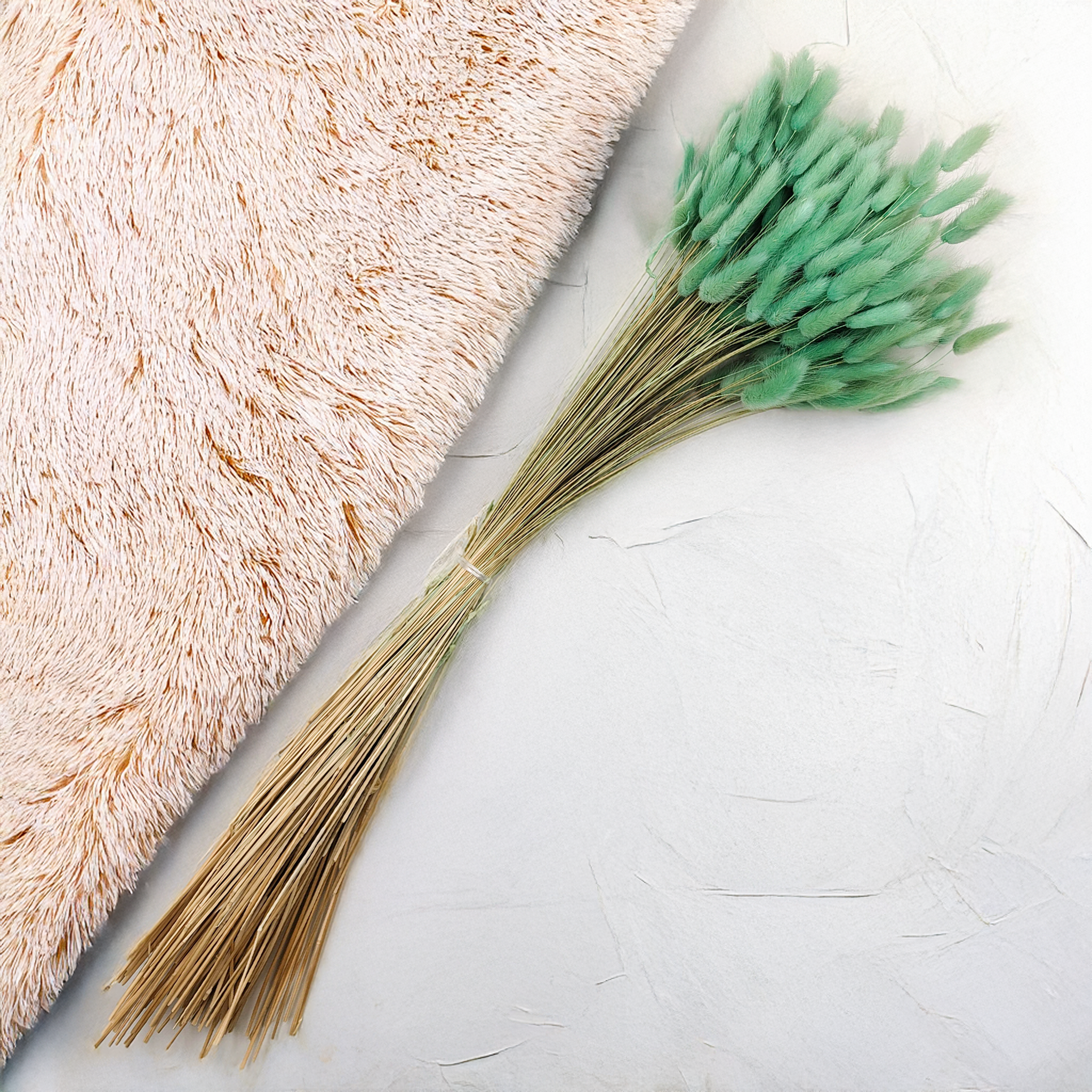 Mintgrüner getrockneter Lagurus (Hasenschwanzgras) ist ein sanfter und frischer Akzent für florale Dekorationen. Die zarte Pastellfarbe steht für Ruhe, Natürlichkeit und Erneuerung – perfekt für Frühlingshochzeiten, DIY-Projekte und stilvolle Wohnräume im Japandi- oder Boho-Stil. Die flauschige Textur bringt Leichtigkeit in jedes Arrangement.