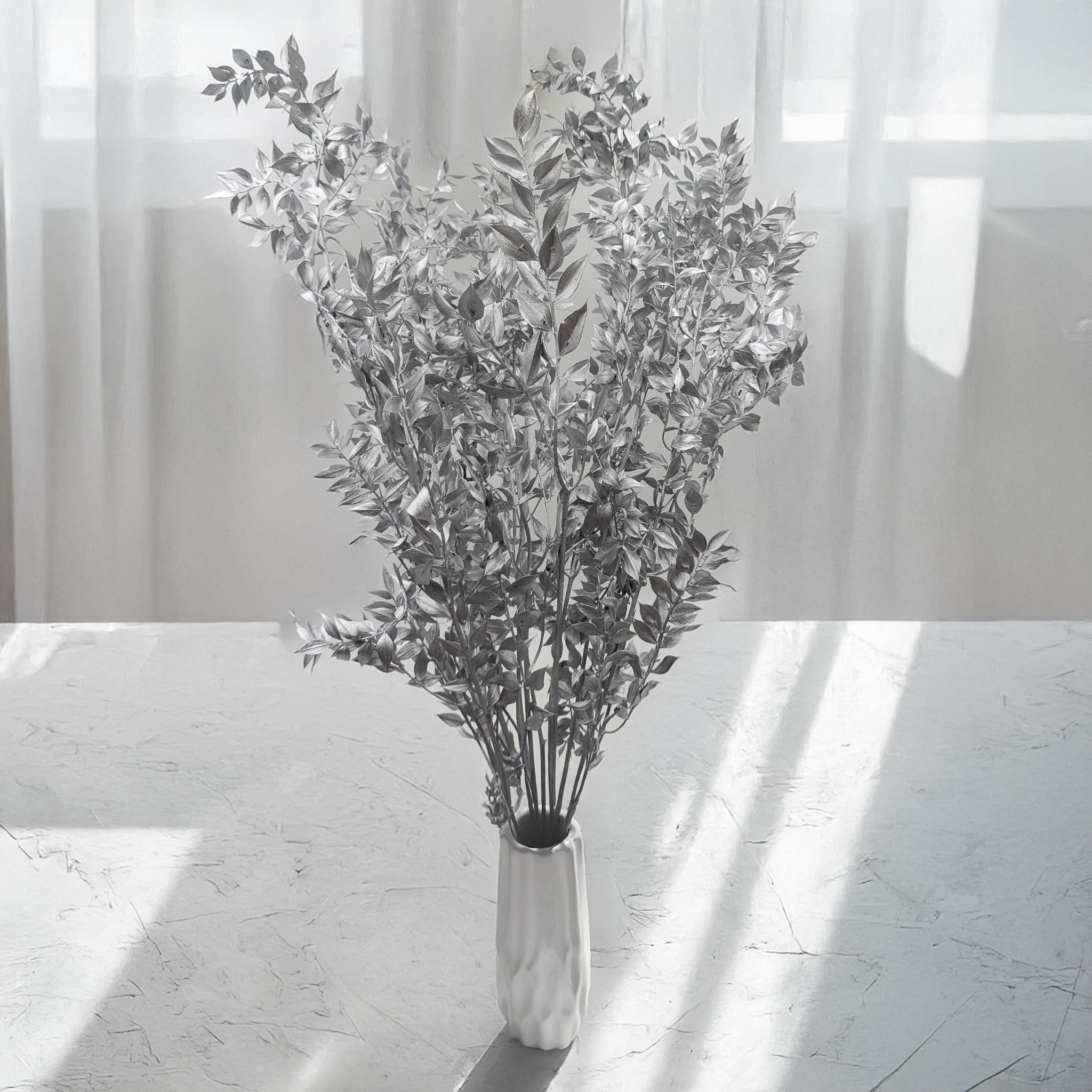 Silberner getrockneter Ruskus ist ideal für elegante, kühle Dekoakzente. Mit seinem metallischen Glanz verleiht er Arrangements einen modernen und stilvollen Touch – perfekt für Winter- und Glamour-Dekorationen. Er ist langlebig, formstabil und pflegeleicht.