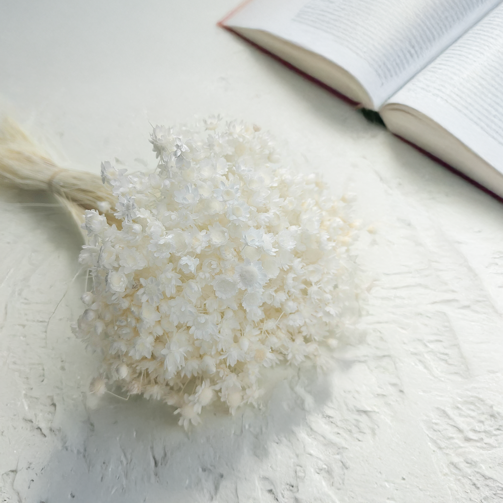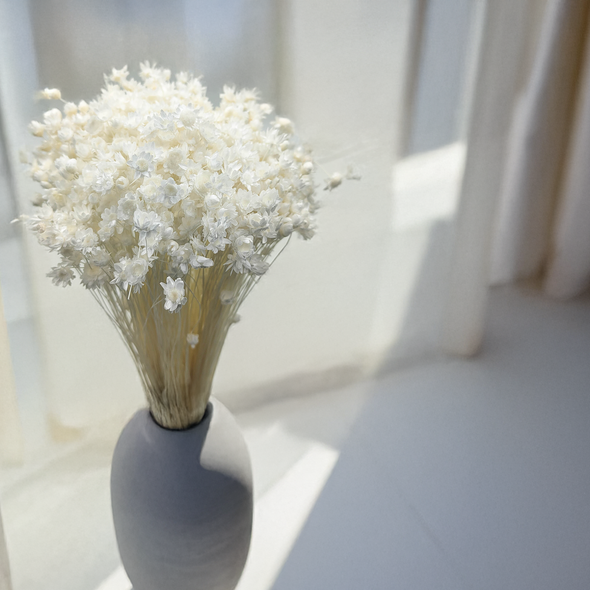 Ein voluminöser, eleganter Strauß aus gebleichter Glixia – alle Pflanzenteile sind vollständig weiß. Diese zeitlose Trockenblume eignet sich ideal für moderne, klassische und minimalistische Dekorationen. Sie strahlt Reinheit und schlichte Schönheit aus.