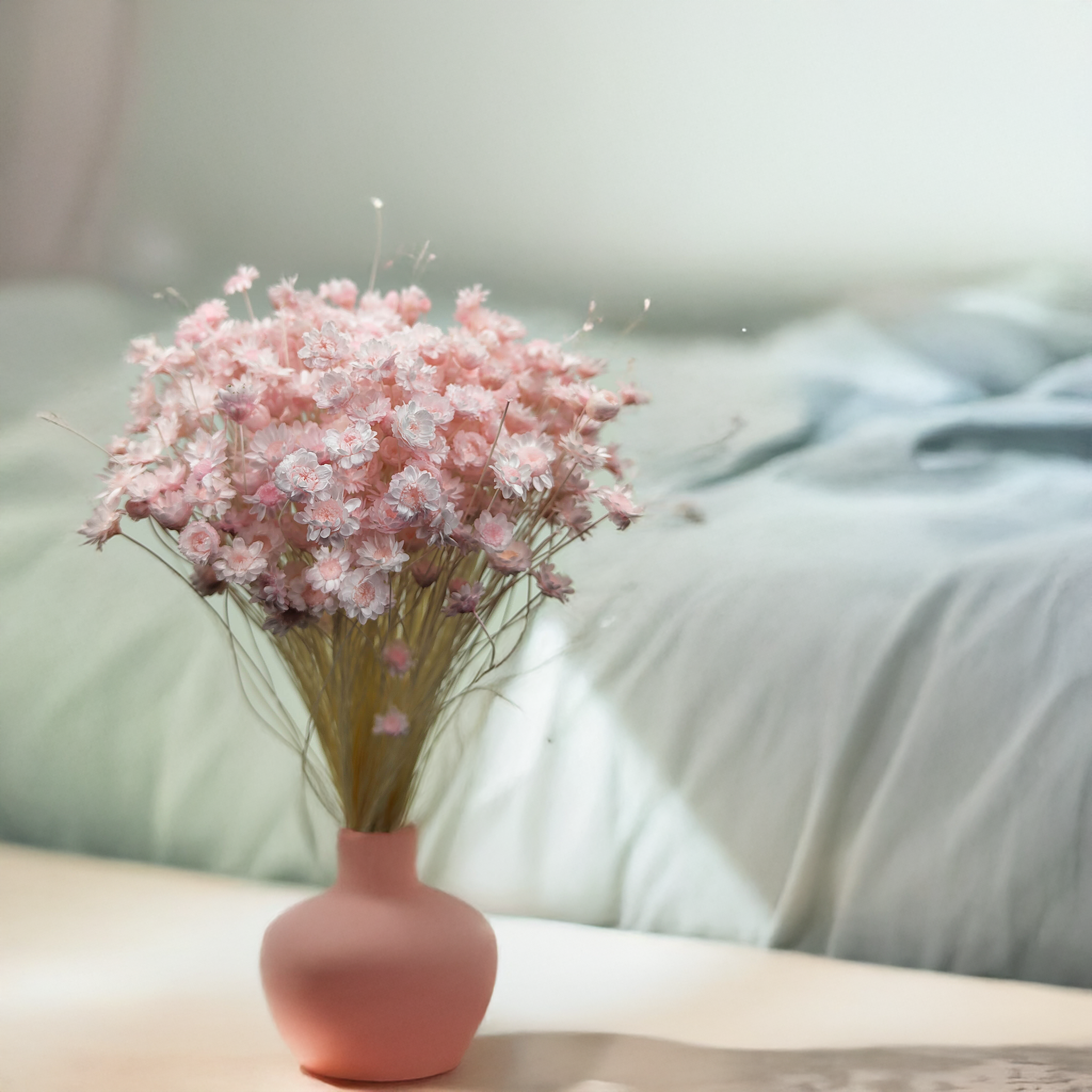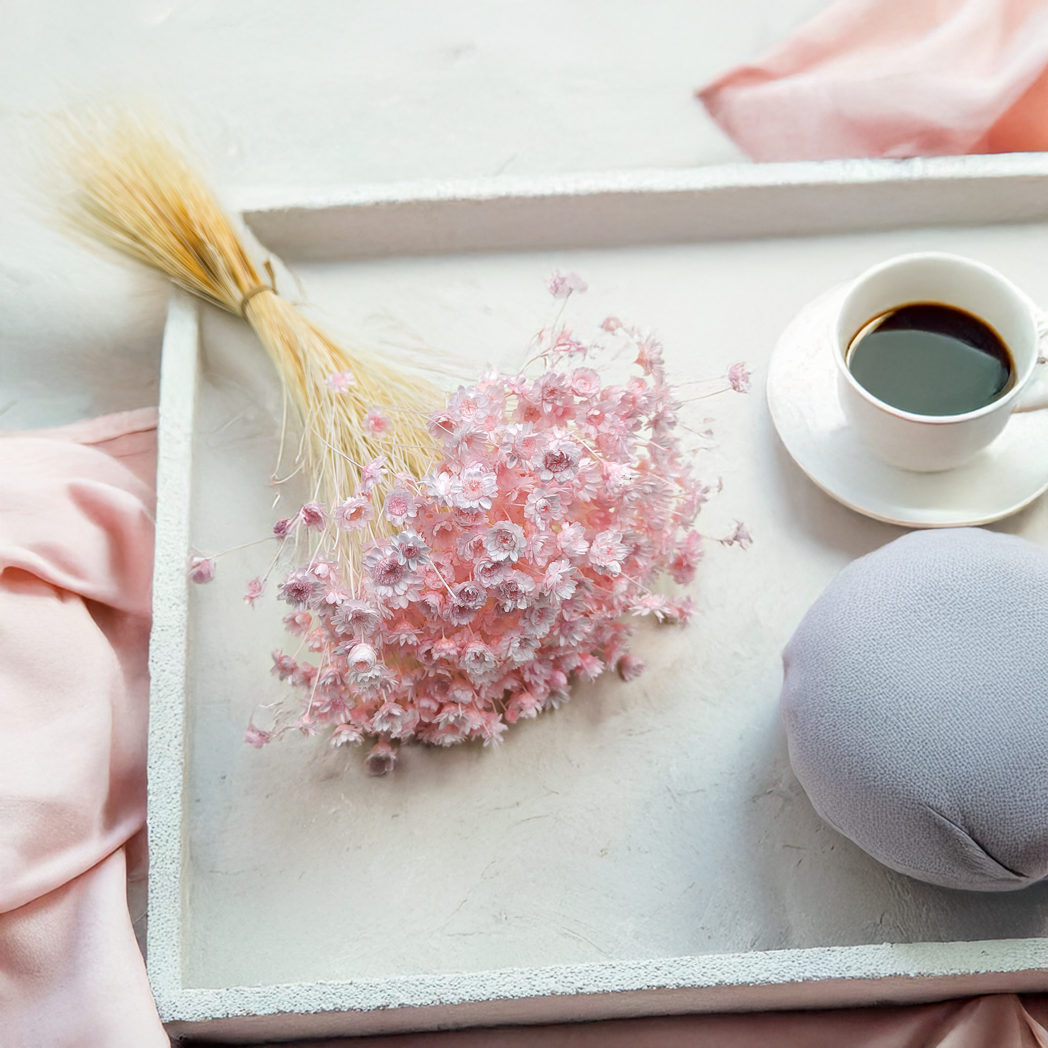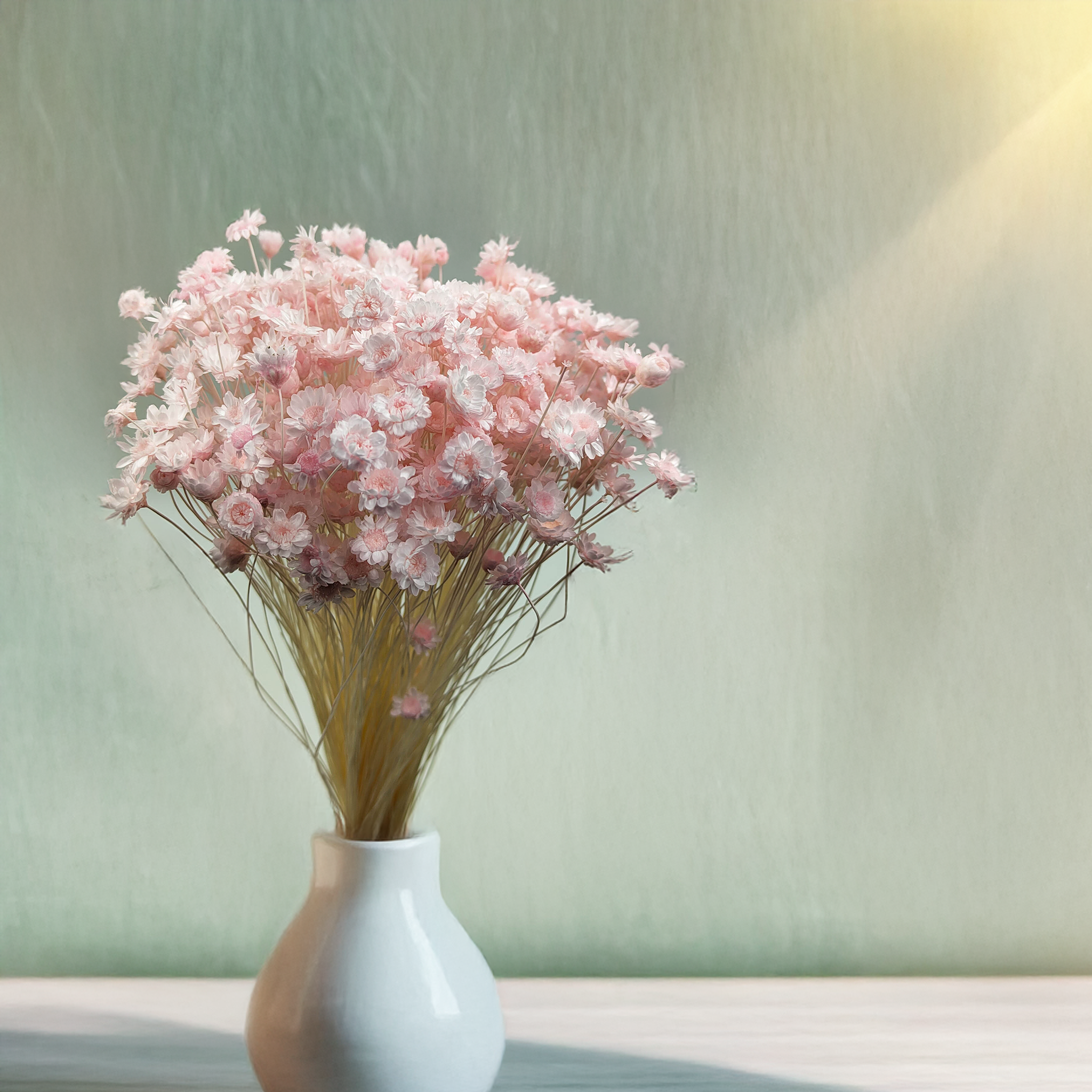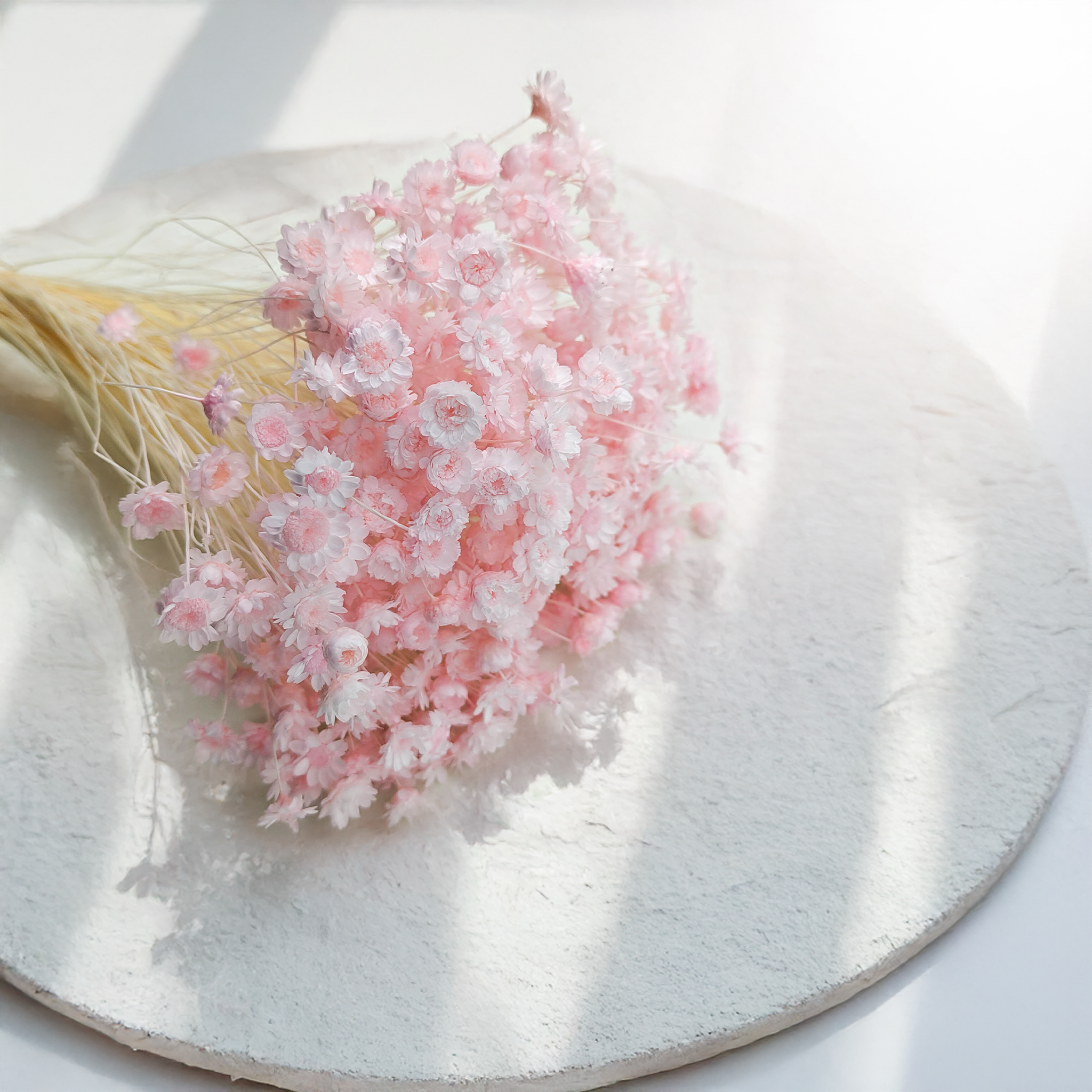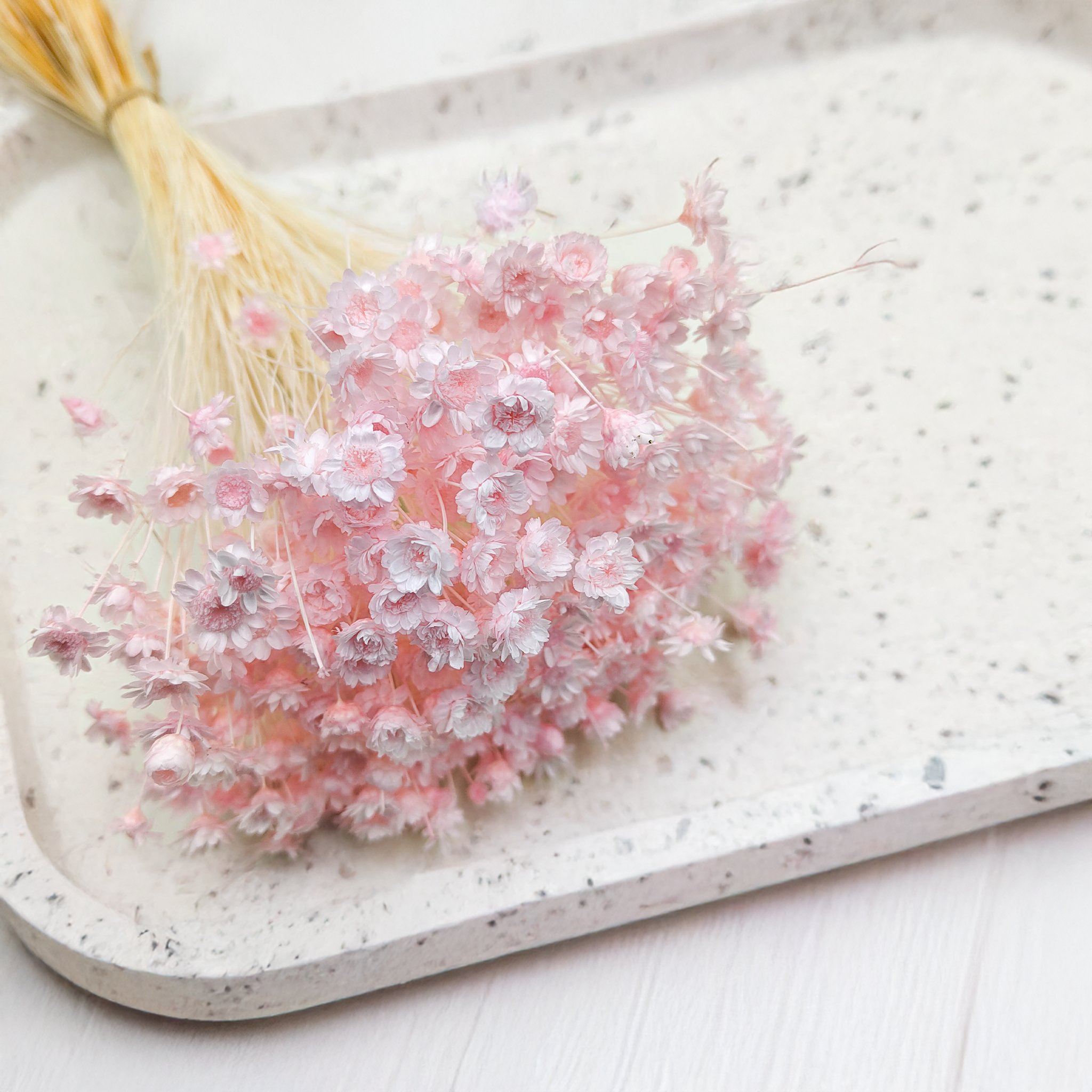 Hellrosa getrocknete Glixia ist eine zarte und romantische Ergänzung für Blumenarrangements und Wohnräume. Ihre pastellfarbenen Blüten verleihen jeder Dekoration Leichtigkeit und Eleganz:
