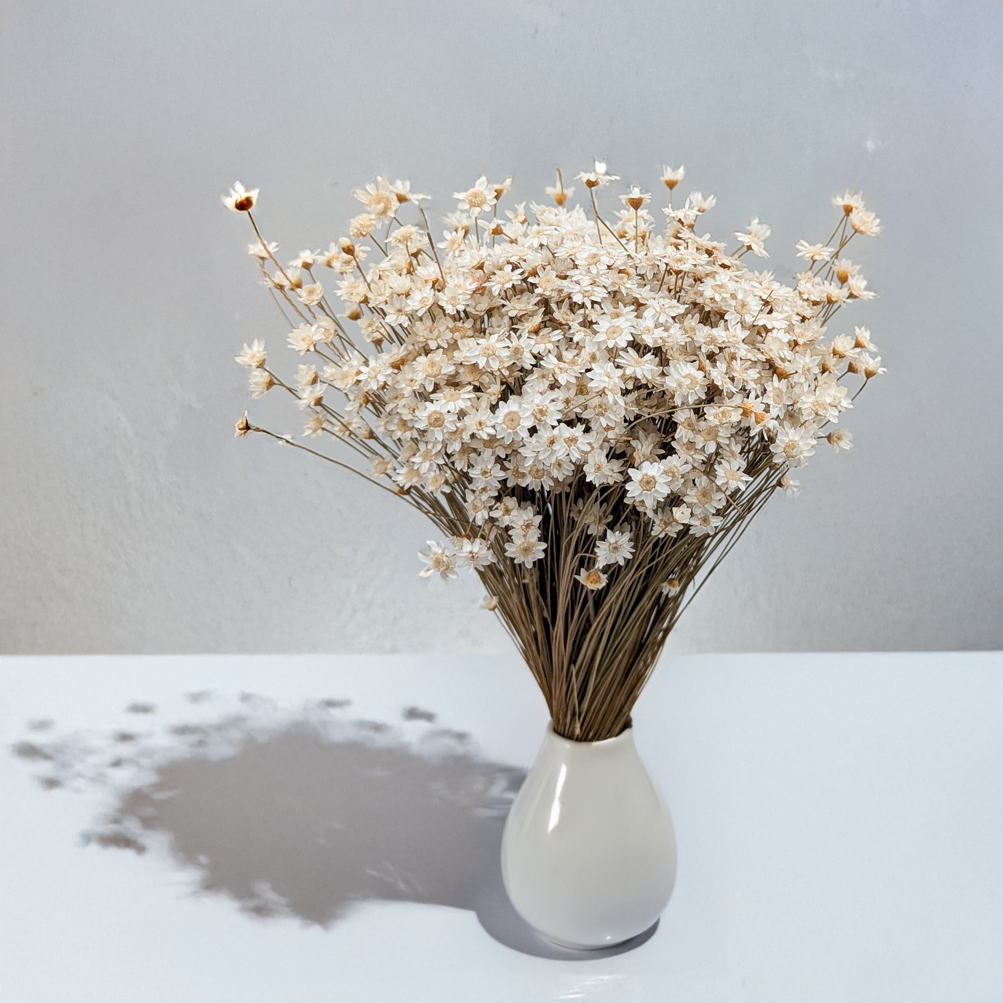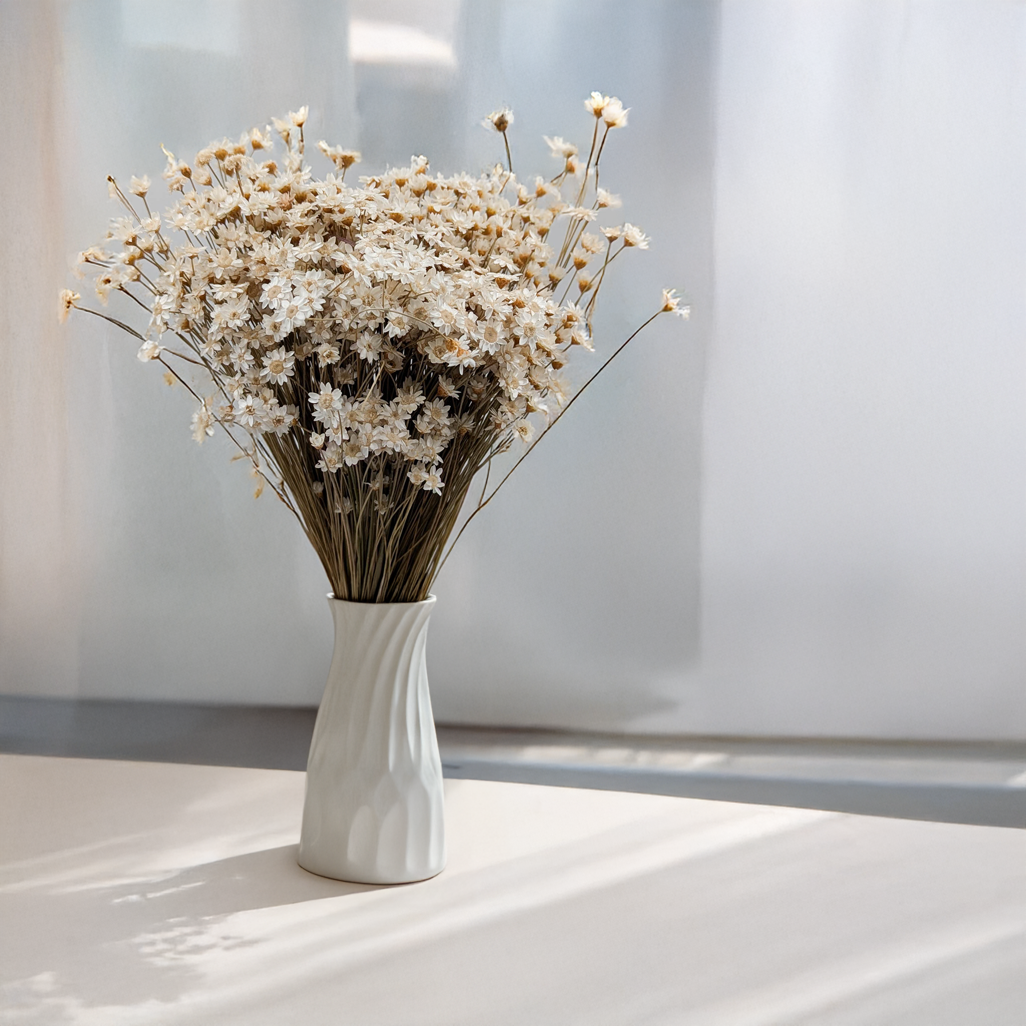 Die getrocknete Glixia in natürlichem Weiß verleiht Räumen eine ruhige und harmonische Atmosphäre. Dank des schonenden Trocknungsverfahrens bewahrt sie ihre ursprüngliche Form und Farbe – ideal als langlebige Alternative zu frischen Blumen.