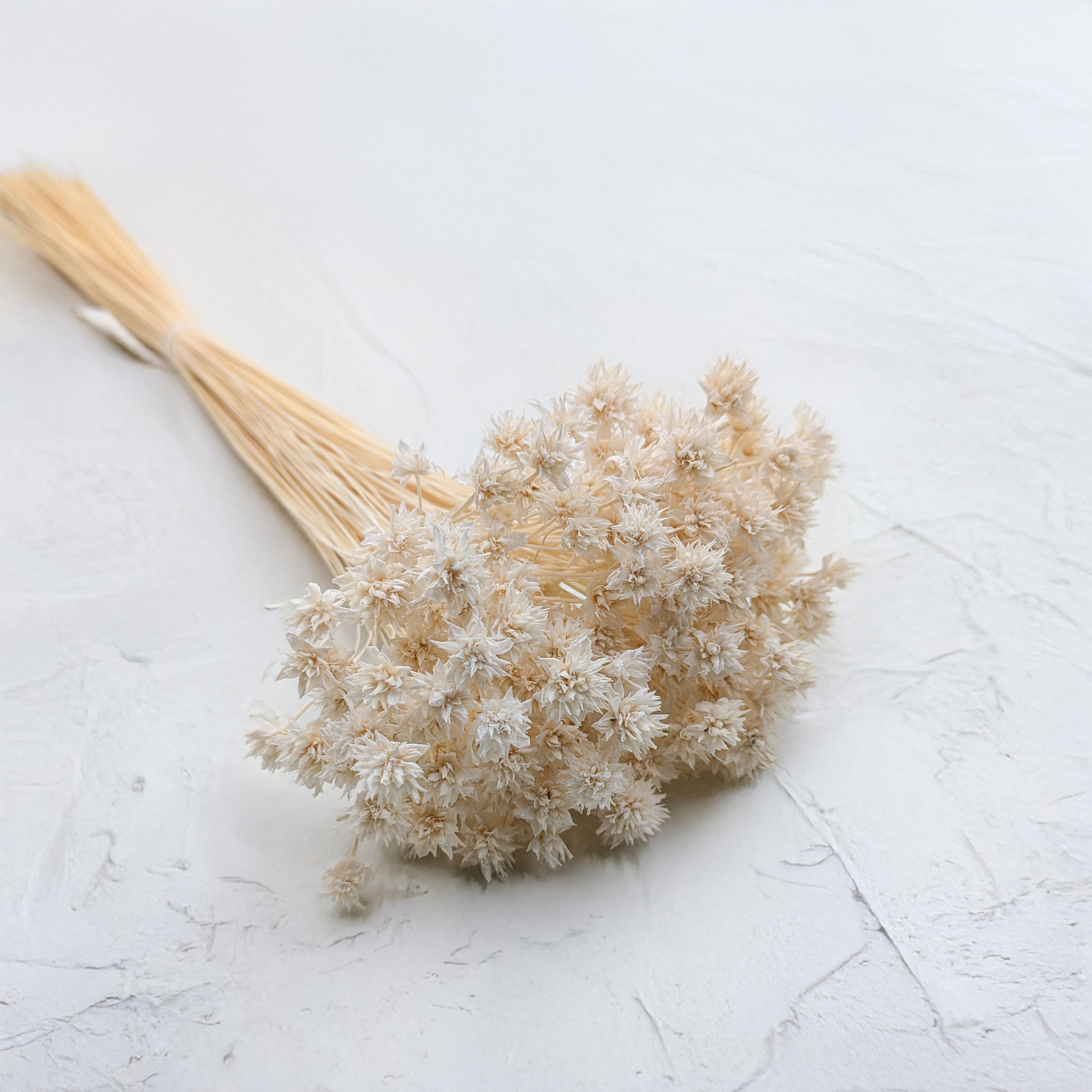 Entdecken Sie den subtilen Charme der gebleichten getrockneten Hill Flower. Dieser elegante Strauß ist eine vielseitige Dekoration, die ein Gefühl von Reinheit und Ruhe in jeden Innenraum bringt. Dank des Bleichprozesses behalten die Blumen ihre natürliche Form und werden so zu einem langlebigen Schmuckstück für viele Monate.