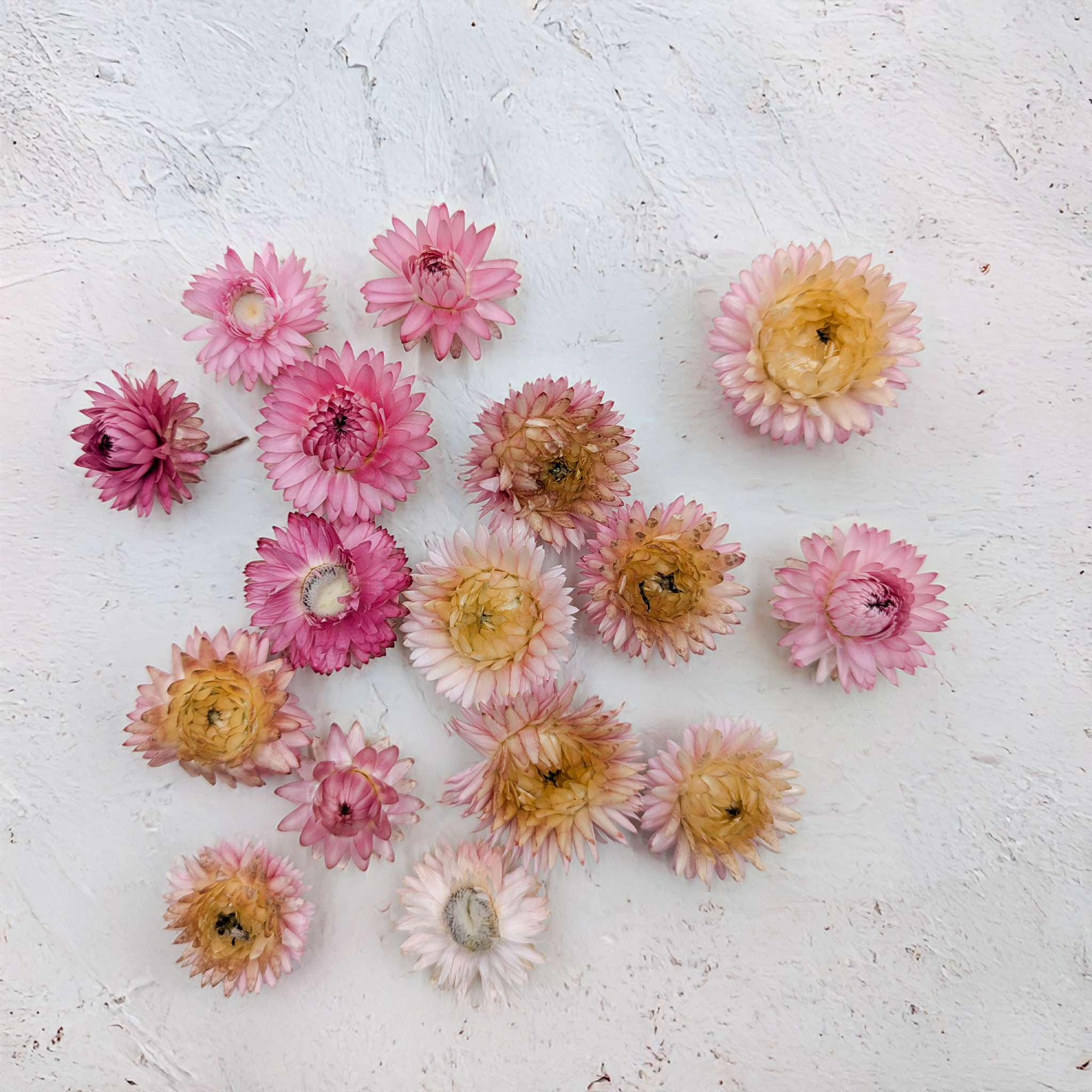 Die getrockneten Blütenköpfe der Immortelle (Helichrysum) sind ein hochwertiges Naturmaterial für kreative Dekorationen. Ihre eleganten Dunkelrosa-Töne bringen Wärme und Natürlichkeit in florale Arrangements und Bastelarbeiten. Sie sind langlebig und pflegeleicht, sodass sie ihre Schönheit über lange Zeit bewahren.