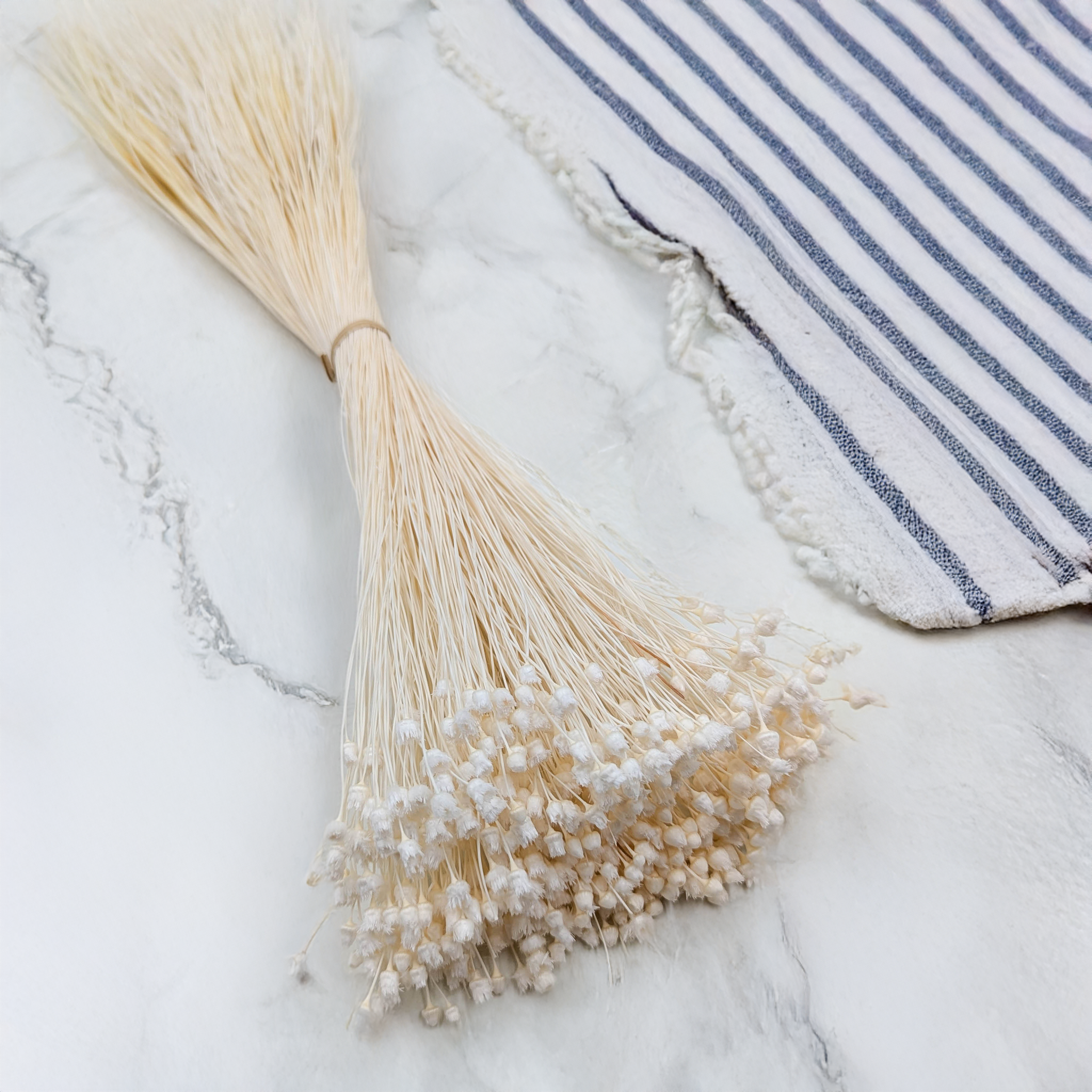 Entdecken Sie den einzigartigen Charme der gebleichten getrockneten Jazilda. Diese Pflanze, auch als Wiesenknopf bekannt, wurde einem Bleichprozess unterzogen, um eine helle Farbe zu erzielen und ihre zarten, filigranen Stiele sowie ihr natürliches Aussehen für lange Zeit zu bewahren. Ihre Eleganz und Subtilität machen sie zu einem idealen Element für vielfältige Arrangements.