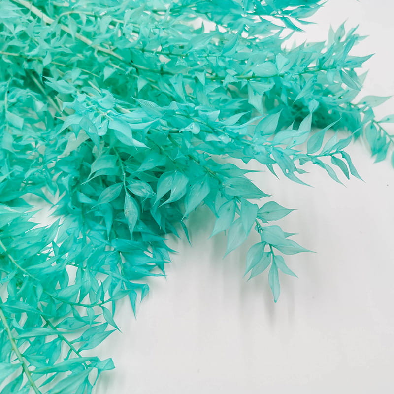 Der mintgrüne stabilisierte Ruscus kann auf vielfältige Weise verwendet werden. Eine Möglichkeit besteht darin, ihn als Füllstoff für Sträuße oder andere florale Kompositionen zu verwenden. Er harmoniert gut mit getrockneten Pflanzen oder anderen stabilisierten Grüntönen oder unter stabilisierten Blumen. Floristen verwenden ihn auch häufig als Element bei floralen Workshops. Der mintgrüne Ruscus erhellt jede Komposition auf wunderschöne Weise.