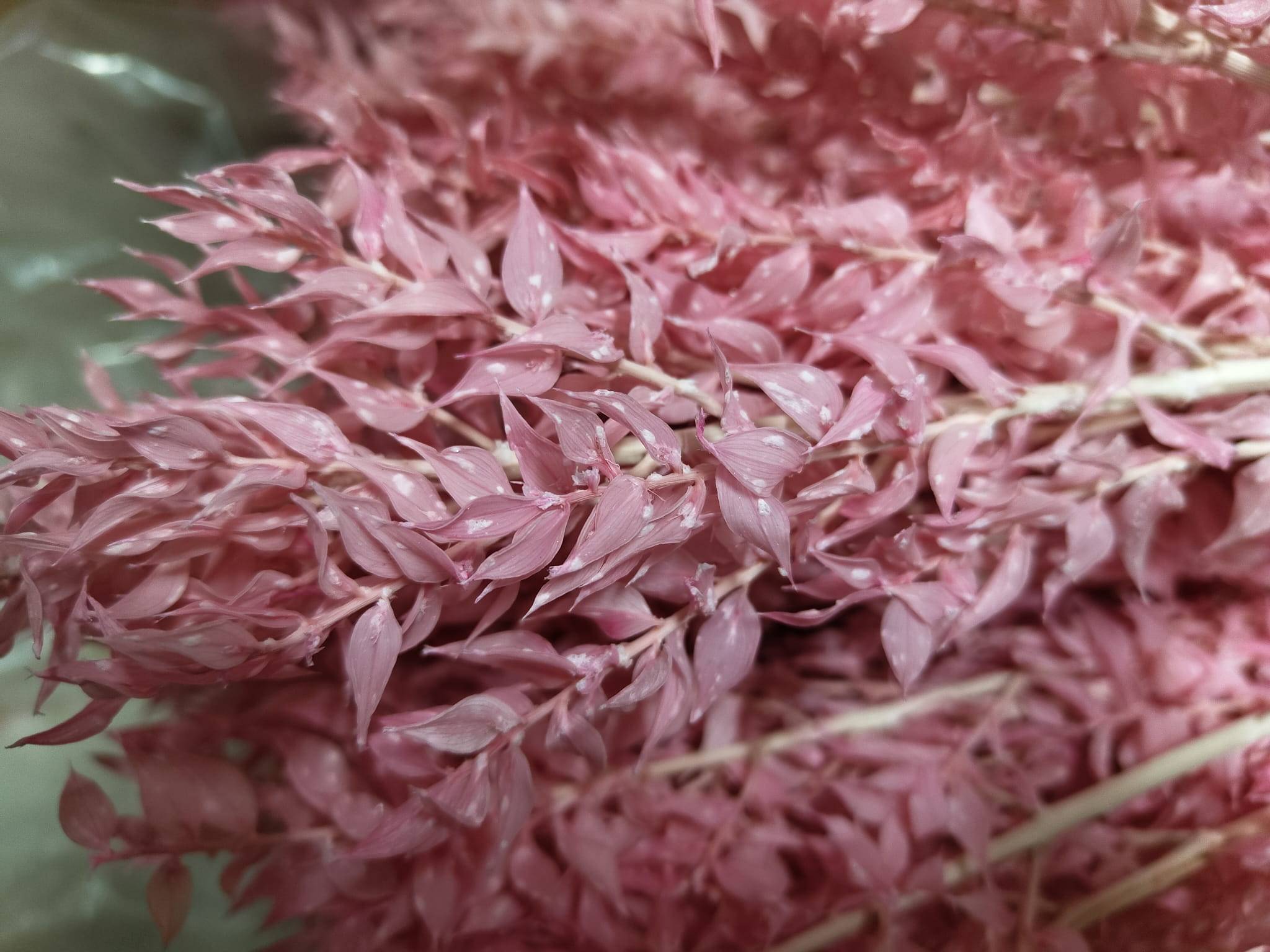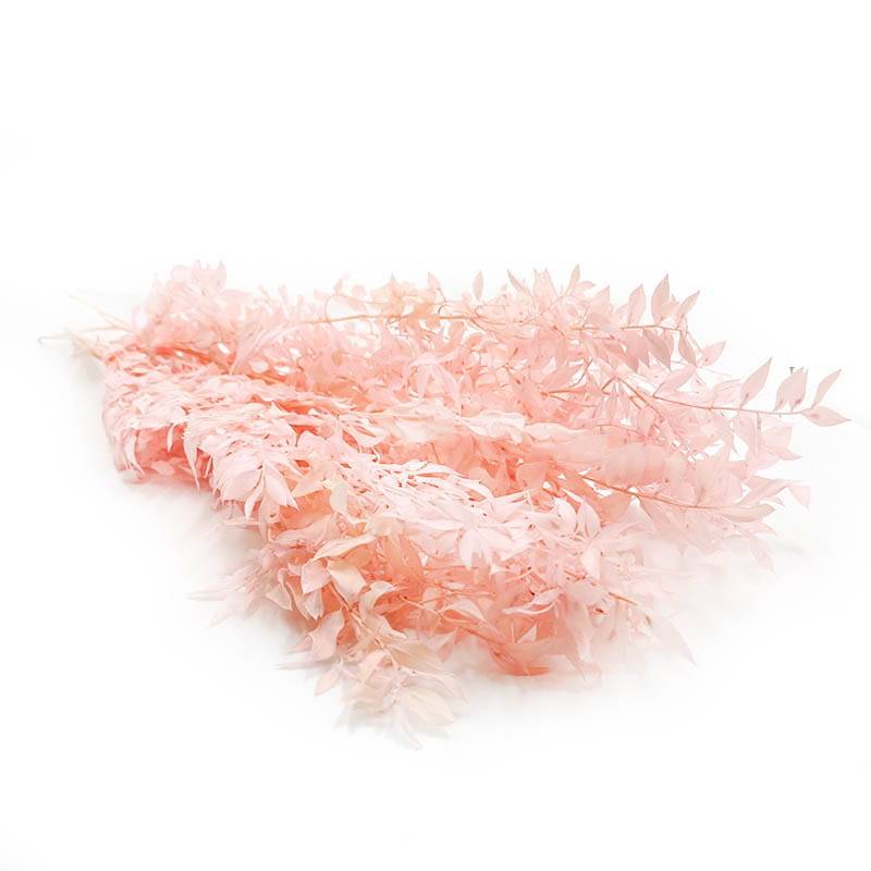 Der Ruscus, stabilisiert in einem Pastellrosa-Farbton, ist eine einzigartige Pflanze, die einen Stabilisierungsprozess durchlaufen hat, um ihr natürliches Aussehen und ihre Farbe für eine längere Zeit zu bewahren. Pastellrosa ist ein zarter Farbton von Rosa, der dem Ruscus eine Note von Subtilität, Sanftheit und romantischen Charakter verleiht und verschiedene Dekorationsarrangements perfekt ergänzt.