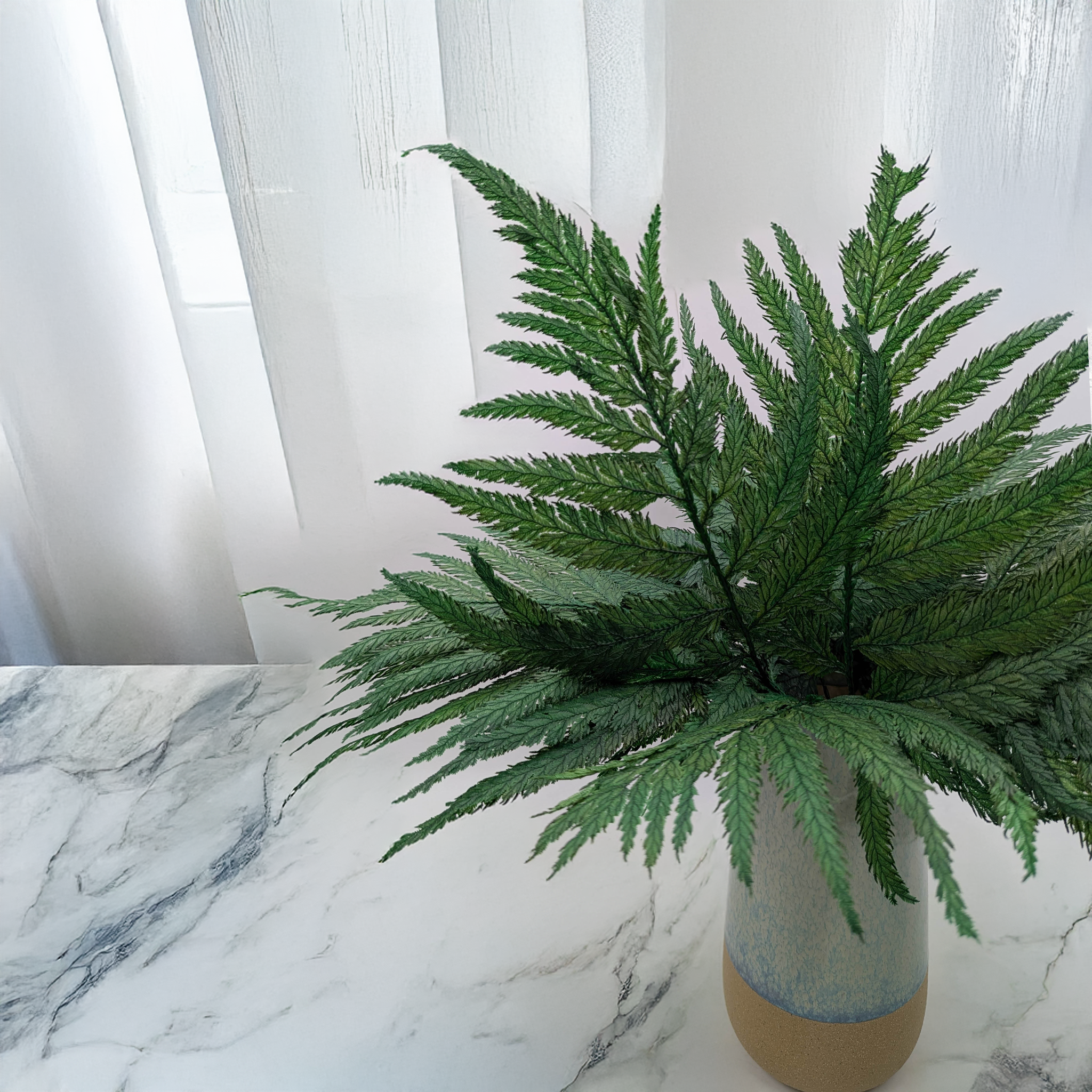 Dieses Produkt ist auch eine verantwortungsvolle Wahl für die Umwelt. Der Stabilisierungsprozess des Farns erfolgt ohne den Einsatz schädlicher Chemikalien, wodurch er umweltfreundlich ist und eine nachhaltige Entwicklung unterstützt. Zusammenfassend ist der Straußenfarn ein praktisches und umweltfreundliches Element, das es Ihnen ermöglicht, einen subtilen, grünen Naturakzent zu genießen, ohne ständige Pflanzenpflege zu benötigen.